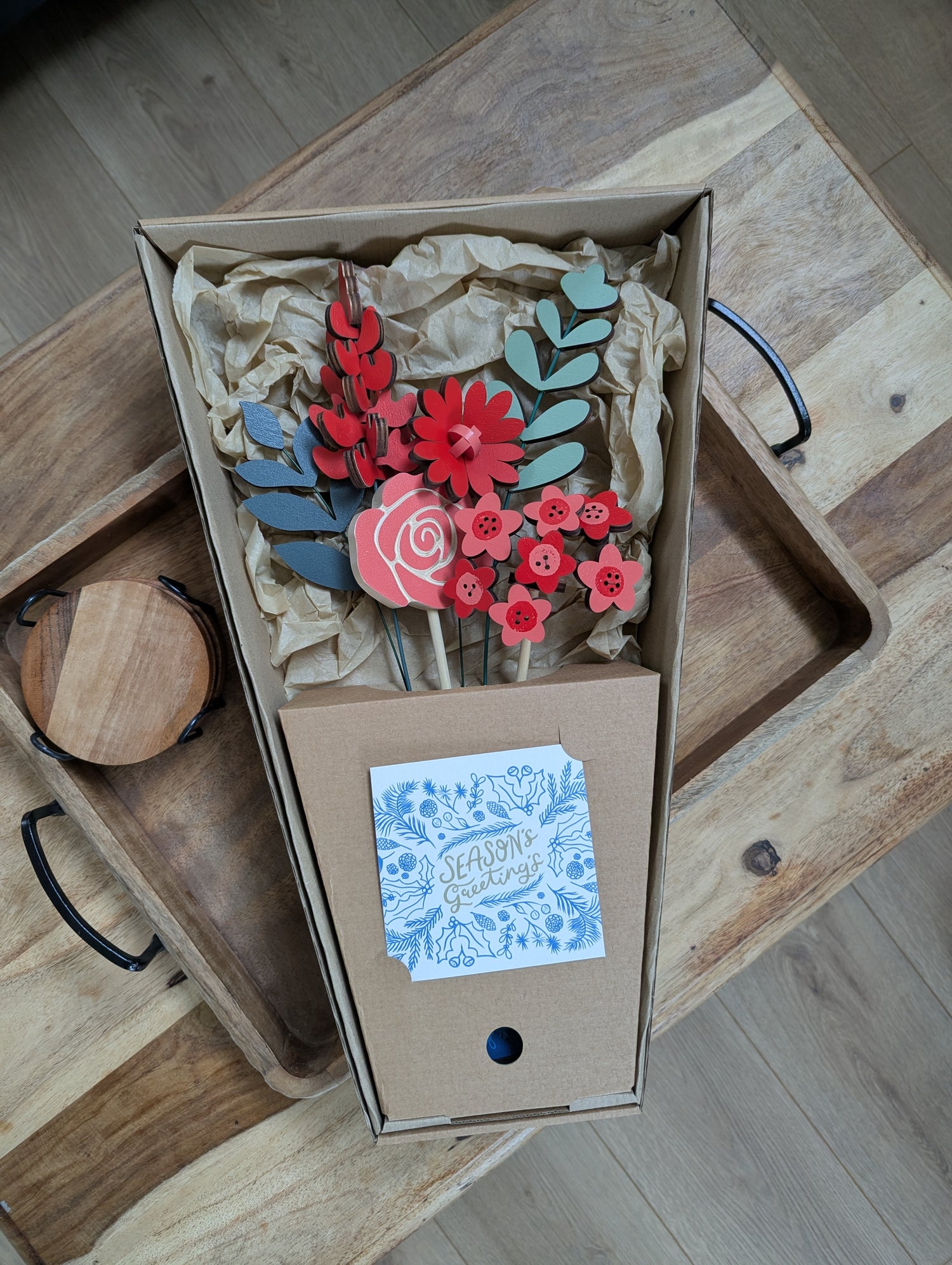 6 wooden flower and foliage stems arranged in our custom postal packaging. Comes with a seasonal card and lots of love.