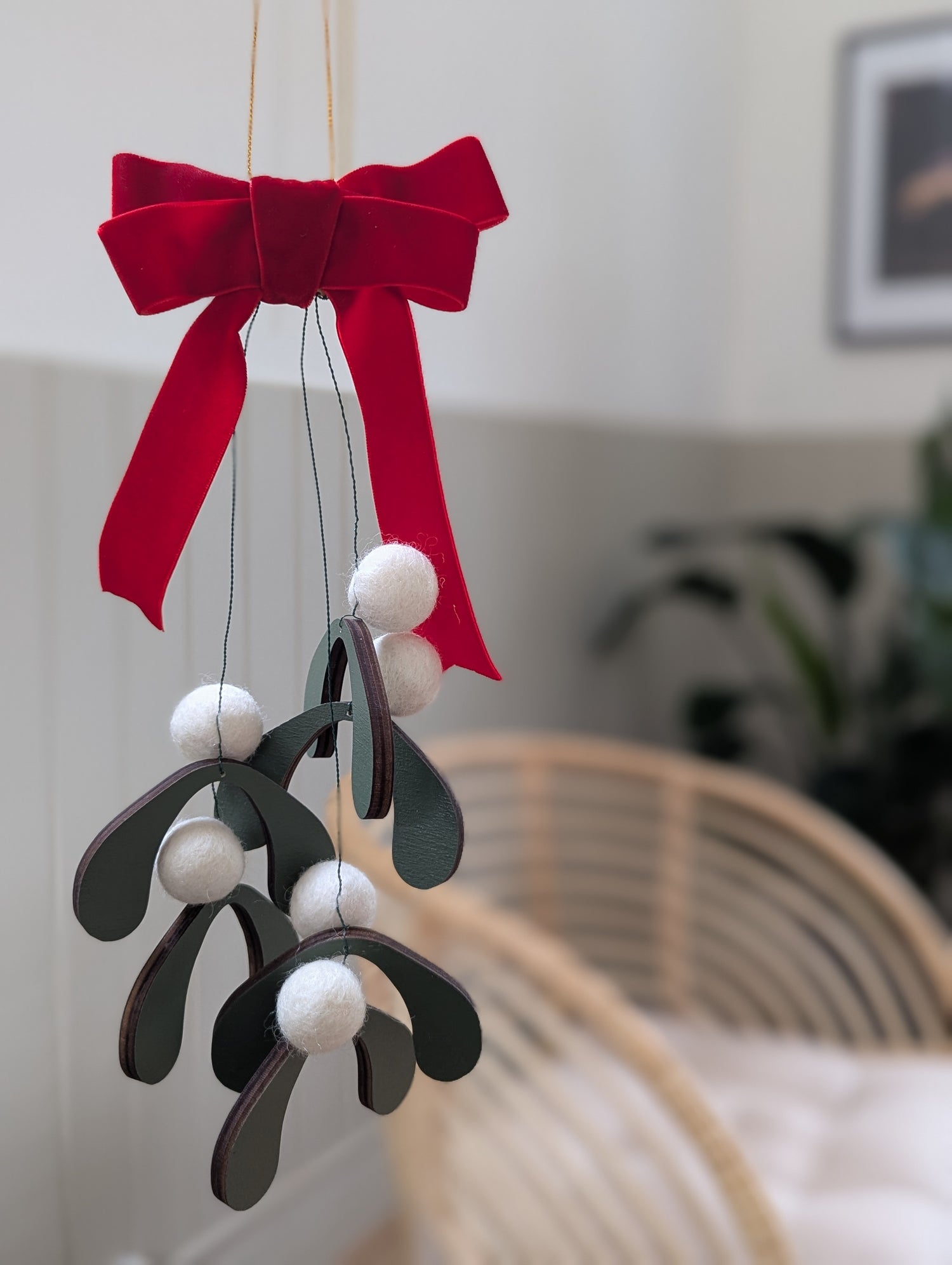Christmas kisses incoming! Olive green mistletoe leaves with wool berries topped with a velvet ribbon.