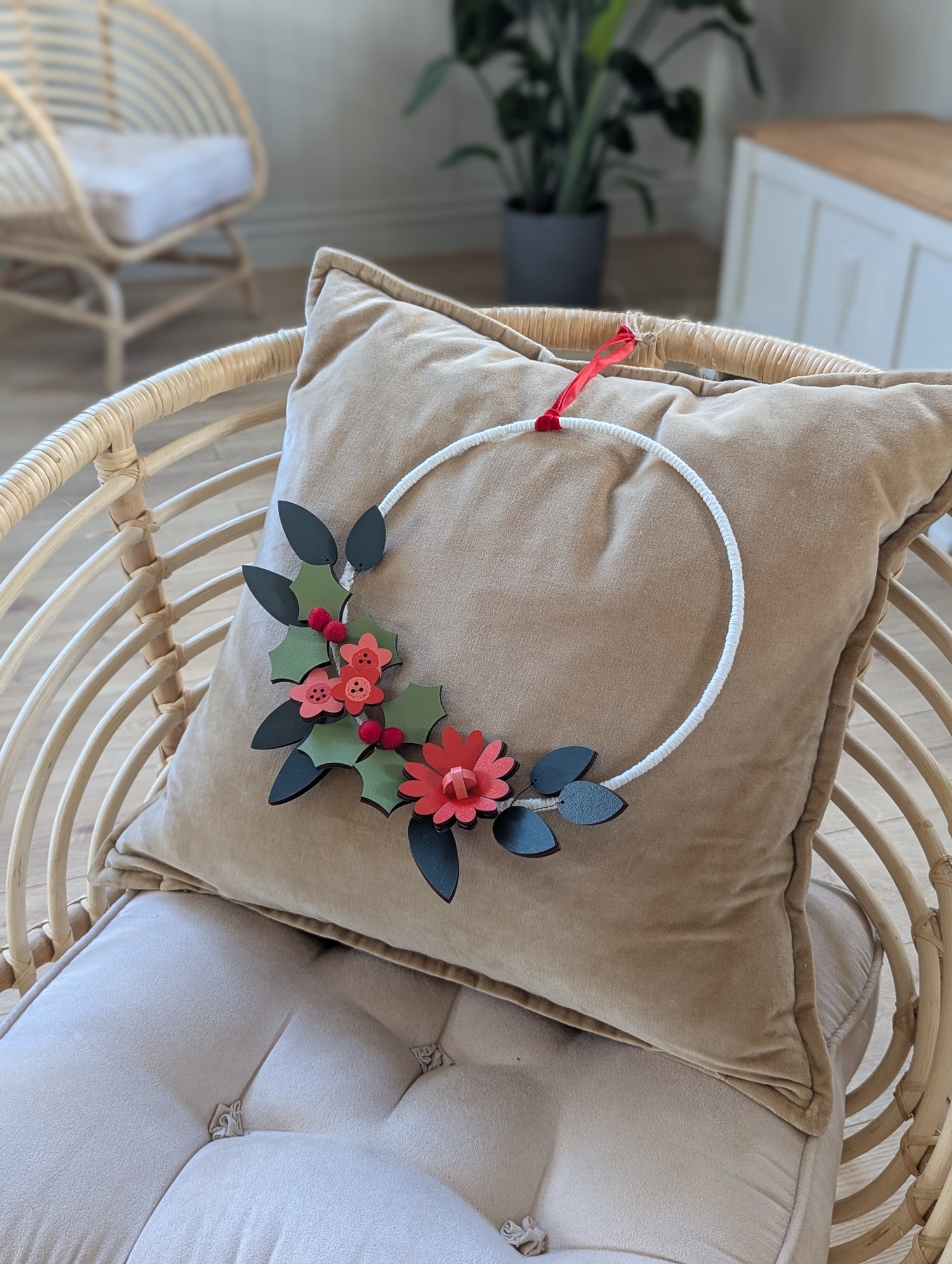 Wooden holly, flowers & wool berries wired onto a 25cm hoop finished in an ivory macrame